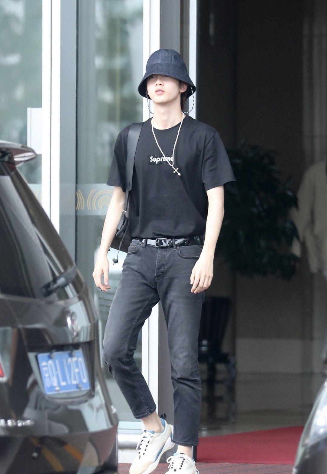 Pair a black shirt with a pair of slim-fitting black jeans. A fisherman hat is also a must-have item for fashionable wear, and can also make your face smaller.