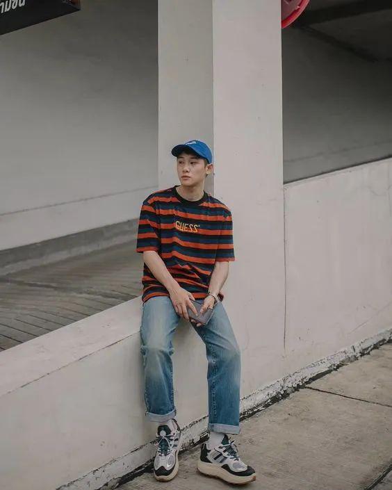 Multiple colors of striped T-shirts are actually difficult to control. At this time, you can use some trendy items to combine them, such as a loose version of denim, plus sports shoes and a baseball cap to avoid a conservative and rigid state.