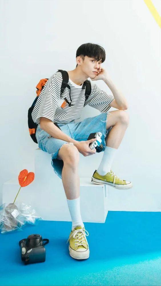 Such a color combination can make the look versatile and trendy. Like this wide-striped blue and white striped T-shirt paired with cargo shorts, the overall look is rich, with sneakers, large white socks and a tote bag embellishment, the shape is full of literary and artistic trends.