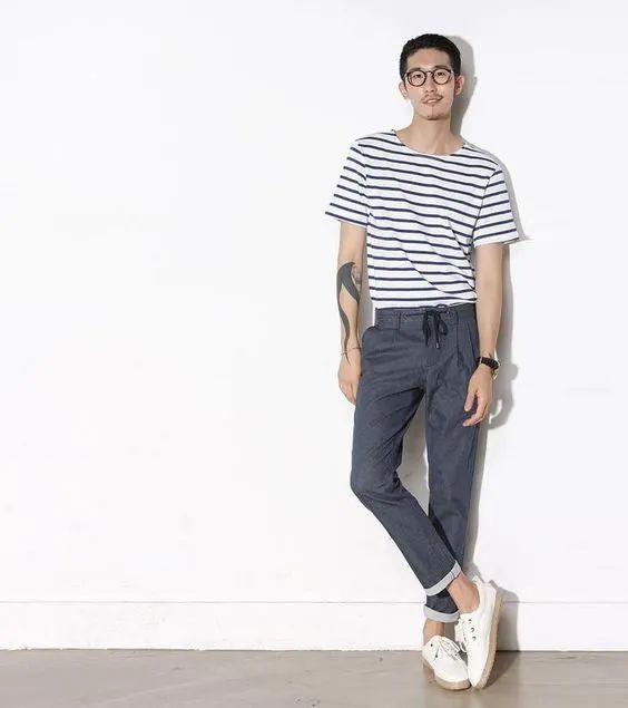 So choosing a striped T-shirt does not necessarily mean creating a youthful and trendy look. It can also match the charm of a calm gentleman. When matching, you must clearly understand the characteristics of a good striped T-shirt, so that you will naturally be clear when choosing pants. .