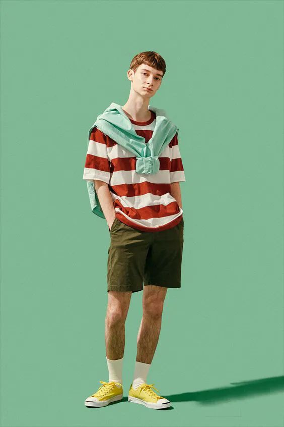 In summer, cool and comfortable styles are very popular , so a striped T-shirt paired with shorts is a good choice. This combination can also make the look more youthful and reduce age.