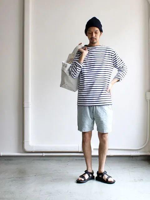 Use a slim-fitting pinstripe T-shirt with a pair of classic Gorg shorts. The style is also blue and white, but the style of the single product is more inclined to business casual style. Add a pair of lazy loafers, and this combination is perfect. It is very suitable for office men, with a simple style and fashionable charm.