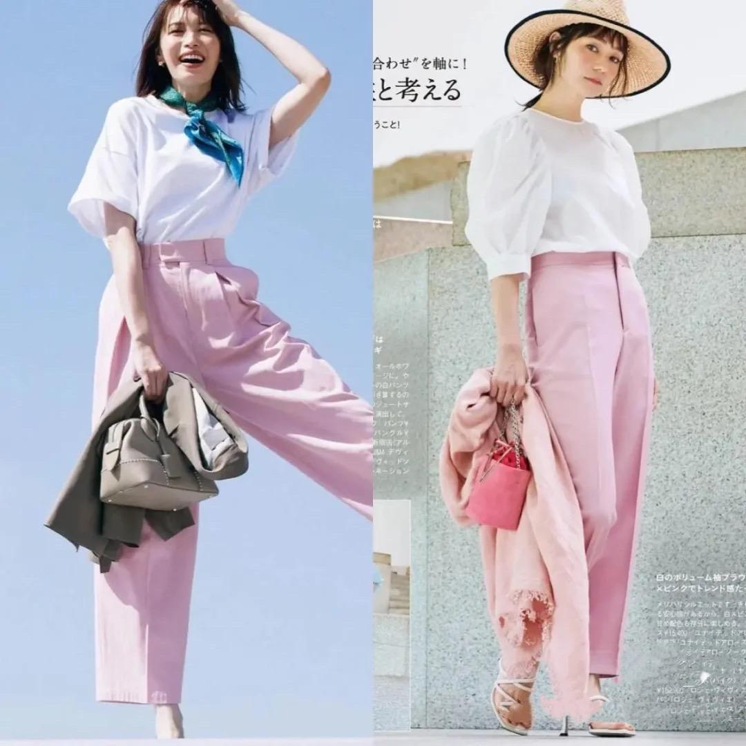 Just like a basic white T-shirt paired with high-waisted wide-leg pants in dragon fruit color , handsome and fashionable, with a stronger overall eye-catching effect. Moreover, if the bright color is placed on the lower body, the skin will not look dull. Even if you have yellow and black leather, you can still try bright-colored bottoms.