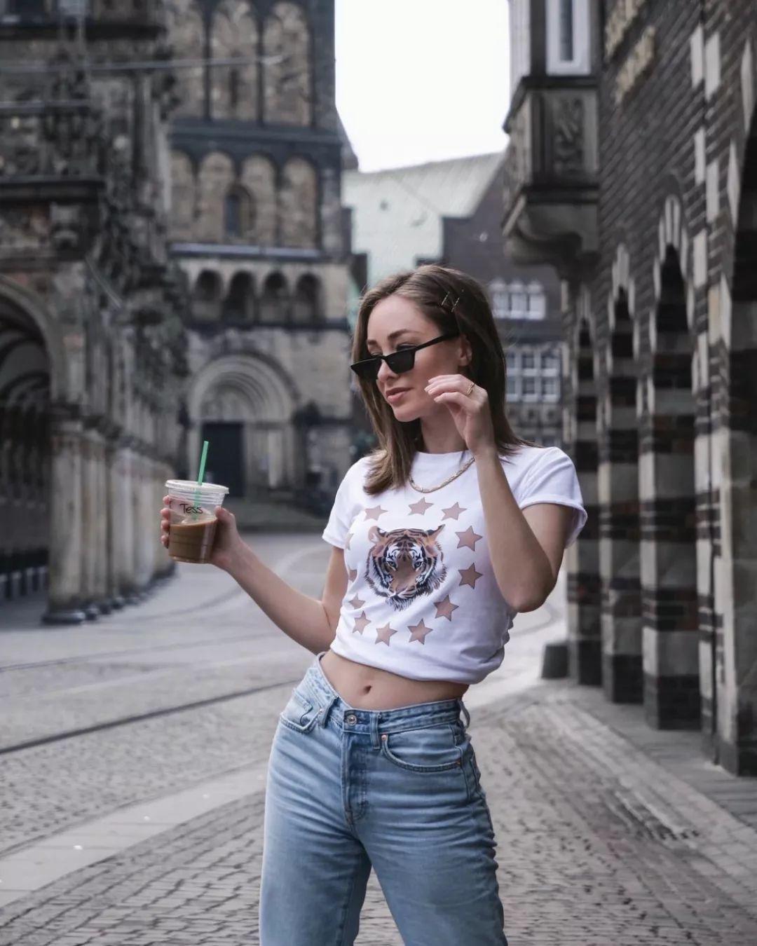 If you feel that tucking in the hem of your white T-shirt will make your bottom look a bit crowded and rushed, thentuck in a small corner It’s also completely possible, and it can also highlight the waistline.