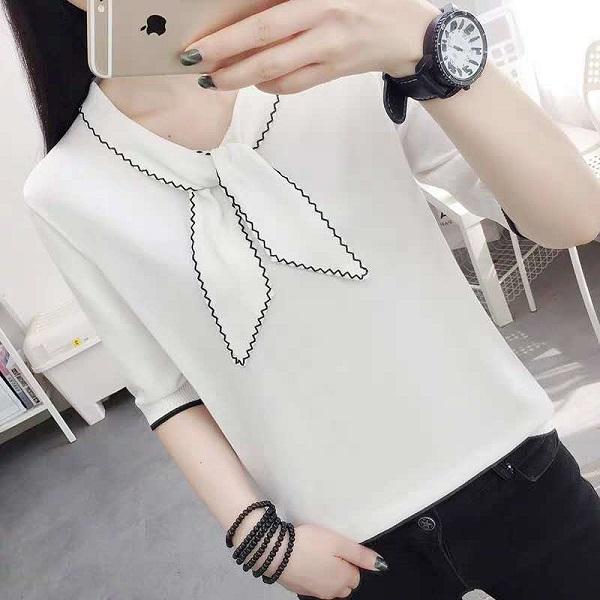 Ice linen fabric has a cool feeling on the upper body. Ice linen is very hygroscopic, very elastic, elegant and free, very suitable for summer. Clothing, the ice linen material with strong skin-friendliness does not feel itchy, the slim fit is capable and comfortable, the bow on the neckline is very age-reducing, the three-dimensional bow is more layered, and the black wavy lines outline it, making the whole thing more coordinated. Highlight the feeling of high-end. Pair it with black leggings for a stylish and commuting look.