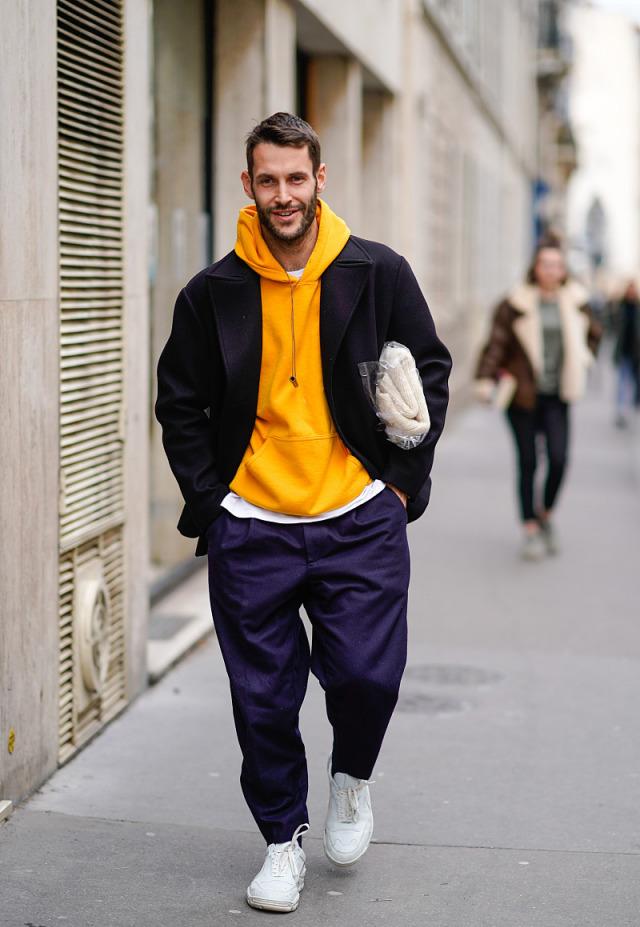 However, compared to the handsome and chic long coat, the short black coat is more everyday, but it is still very aura. At this time, if you want to be more friendly, you can choose a hooded sweatshirt with a brighter color as the inner wear. Yellow is a good color choice.