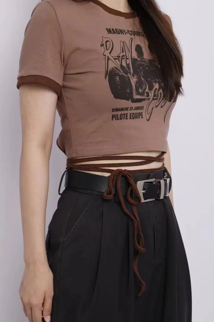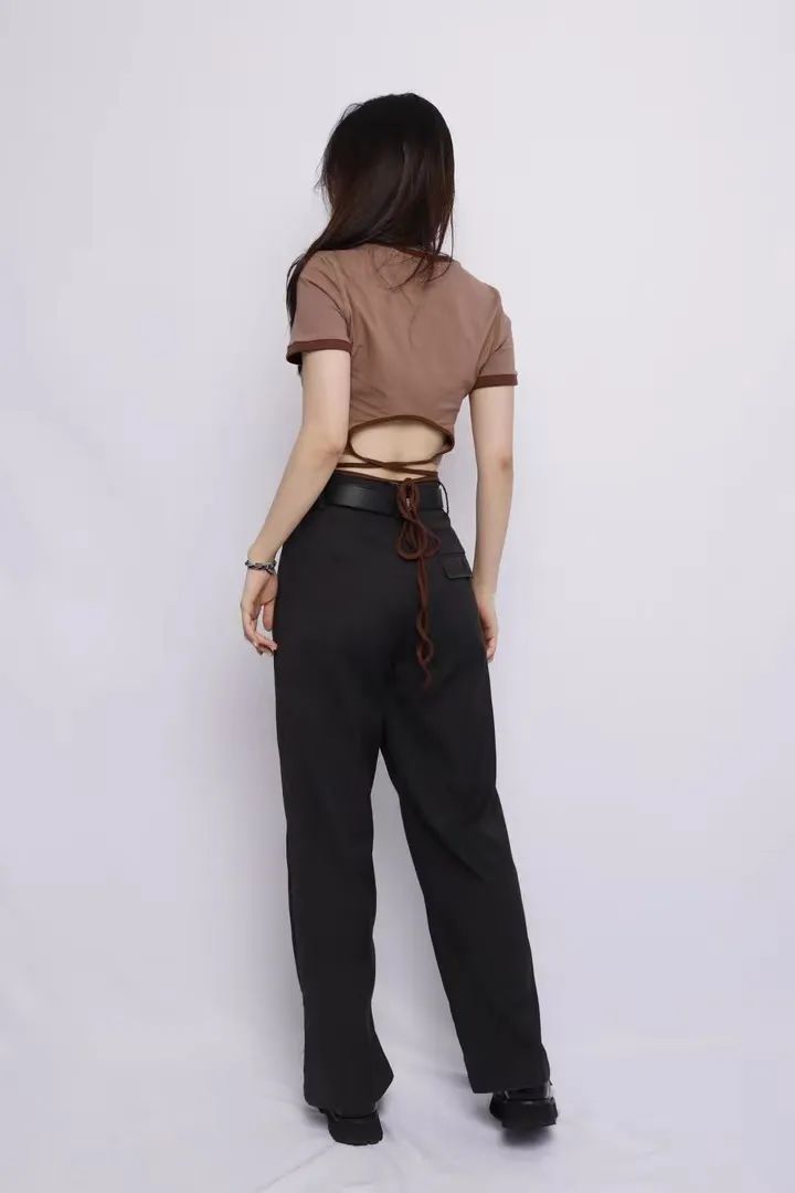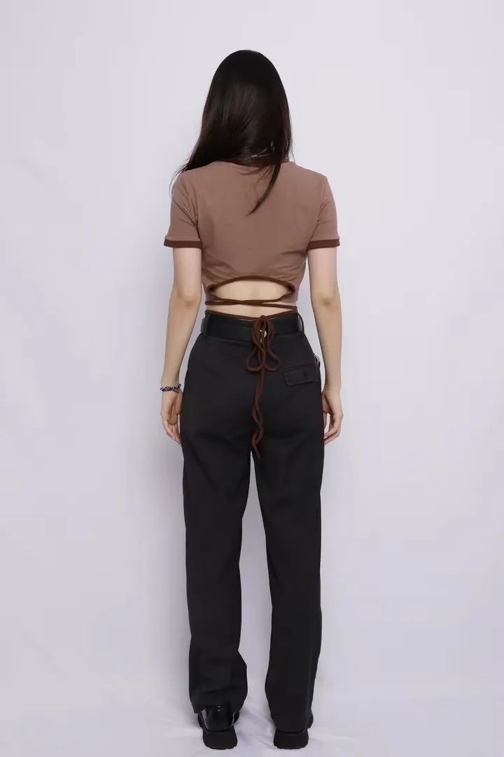 After this T-shirt The waist is made into a hollow strap design, which fits this highly personalized design style well. The hollow strap design at the back of the waist does not expose much skin, revealing a small waist, highlighting the “little sexy” look. The length of the straps allows girls to freely change the tying method and change the style as they please.