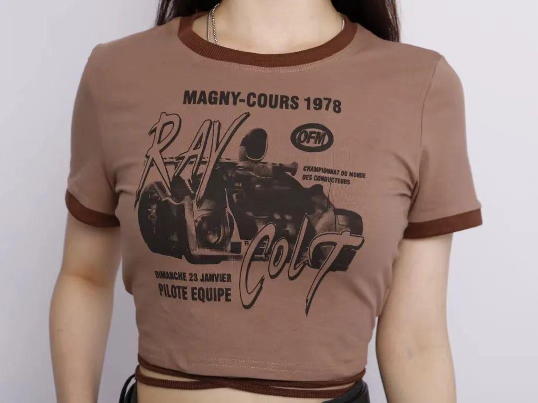 The collar and cuffs are sewn with a circle of dark contrasting rib piping, giving it a strong American retro style. There is a large monochrome watermark printed on the front of the T-shirt. The texture is soft and close-fitting, making the overall design less monotonous and adding a retro feel. The slim-fitting short version has good wrapping properties and especially highlights the body curves.