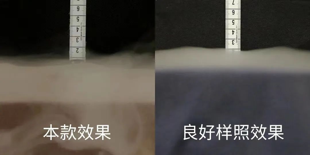 The evaluator places the tested clothing on the humidifier and smooths it, turns on the power, observes and records the height that the gas reaches through the clothing in the same period of time (about 3-6 seconds), and the height reached by the sample. Compare the photos to evaluate the approximate breathability of the clothing being tested.