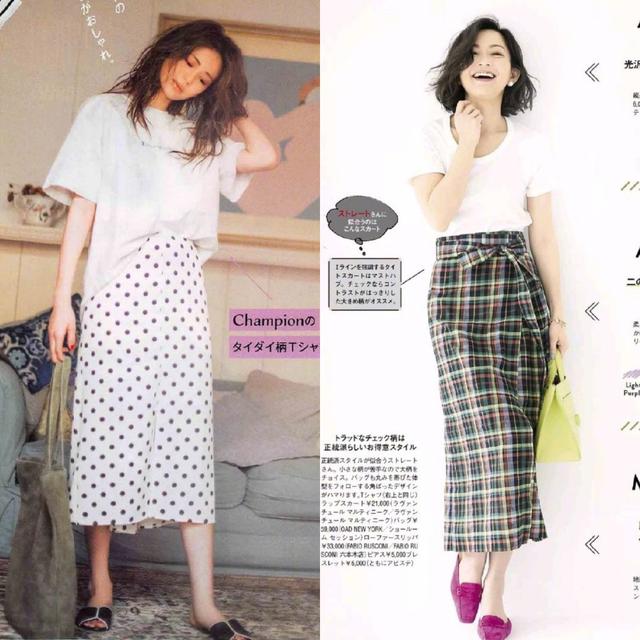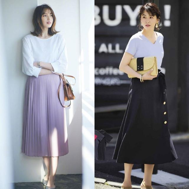 As shown in the picture above, a pure white T-shirt can be paired with a royal blue skirt or a bright orange skirt. There is no sense of disobedience, but a bit more lively and energetic. In particular, the straight-up and straight-down version of the skirt has a good effect on modifying the shape of the legs, allowing you to easily wear it to create a tall and good figure.