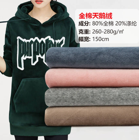Cotton velvet: The fabric composition is 80% cotton + 20% polyester. Its weight and width are 280g/m² and 160cm respectively. The fabric is slightly elastic and soft. It has high content and is not easy to fluff. It is suitable for the production of sweatshirts, sweatpants and blankets. The wholesale price of the fabric is 35 yuan per meter.