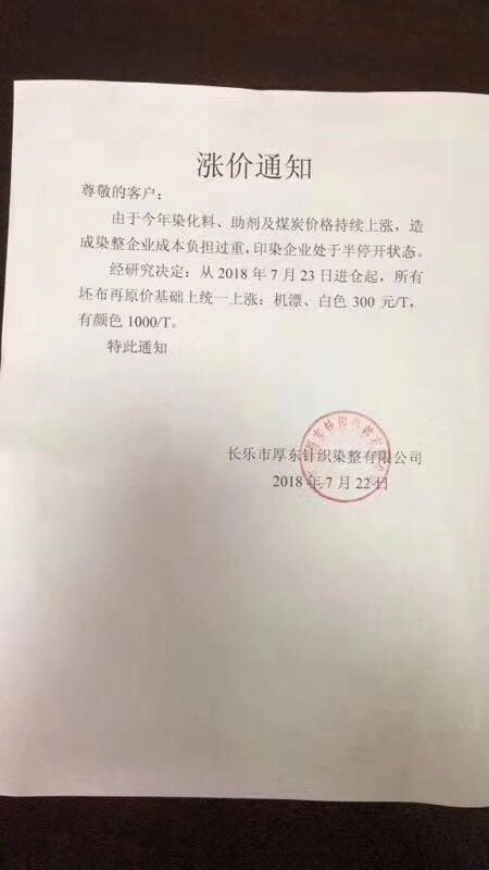 From the price increase notice, we learned that some dyeing factories in Fujian will start from July 23, 2018 After entering the warehouse, all gray fabrics will rise uniformly on the basis of the original price. The increase will be 300 yuan/T for white and 1,000 yuan/T for colored fabrics. As the prices of dyeing materials and auxiliaries continue to rise, enterprises have an excessive cost burden. Affected by the normalization of environmental protection inspections, printing and dyeing enterprises have increased prices!