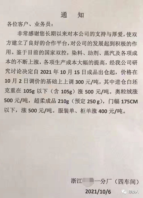 It was learned that “from October 5th, the dyeing fee prices will be adjusted as follows on the original basis: the dyeing fee for cotton series and imitation cotton series will be increased by 600 yuan/ tons; bleaching and cleaning categories will be increased by 200 yuan/ton; other categories will be increased by 300 yuan/ton. The card opening date will be October 5th.” The person in charge of a printing and dyeing factory in Ningbo, Zhejiang Province posted this in Moments.