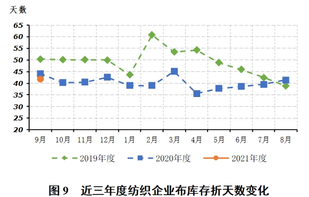 In early September, the yarn production and sales rate of the sampled enterprises was 90.8 %, a month-on-month decrease of 2.6 percentage points, a year-on-year increase of 2.1 percentage points, and a decrease of 6.0 percentage points from the average level of the same period in the past five years (2015-2019); inventory is 14.9 days of sales, a month-on-month increase of 1.7 days, a year-on-year decrease of 10.5 days, and a year-on-year decrease of 10.5 days. In the past five years (2015-2019), the average level during the same period has decreased by 5.6 days (Figures 7 and 8). The production and sales rate of cloth was 84.7%, a month-on-month decrease of 0.1 percentage points, a year-on-year decrease of 1.1 percentage points, and a decrease of 8.0 percentage points from the average level of the same period in the past five years (2015-2019); the inventory was 41.8 days of sales, a month-on-month increase of 0.4 days, It decreased by 2.4 days year-on-year and 4.2 days less than the average level of the same period in the past five years (2015-2019) (Figure 7 and Figure 9).