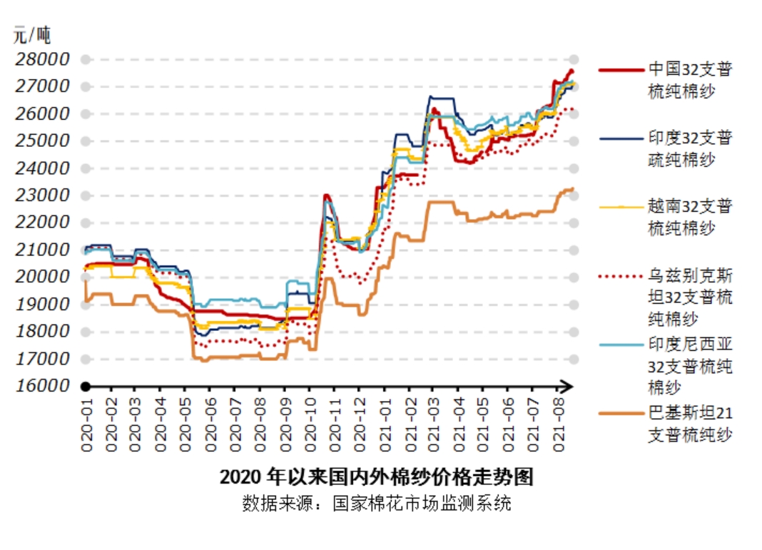 4. Domestic cotton yarn prices rose first and then fell, while international cotton yarn prices continued to rise