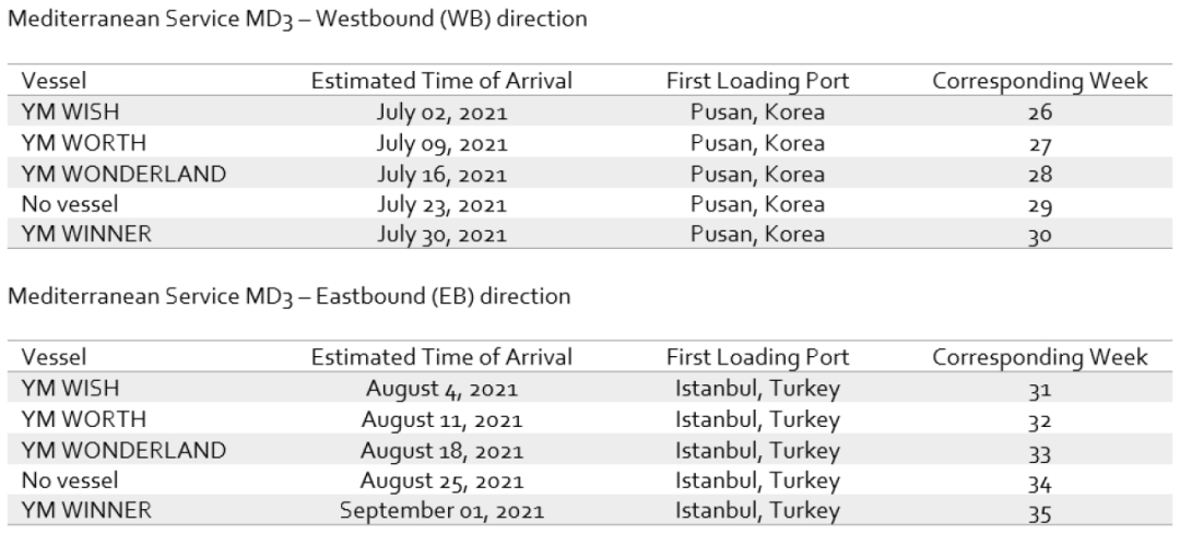 Hapag-Lloyd announced the following changes to the alliance’s MD1 and MD3 service schedules: