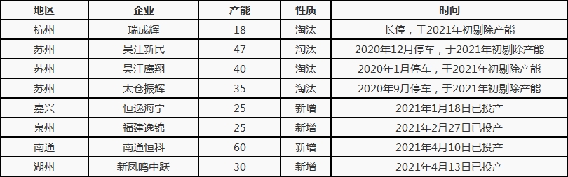 Table 3 Overview of domestic polyester filament production capacity changes in 2021 Unit: 10,000 tons/year