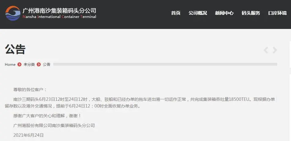 On the afternoon of June 24, Guangzhou Port Co., Ltd. Nansha Container Terminal Branch (Nansha Phase III Terminal) issued an announcement on its official website stating that based on the number of retained orders and traffic conditions outside the port, Nansha Phase III Terminal has been closed on June 24. At 12 o’clock, the order processing business will be fully resumed.