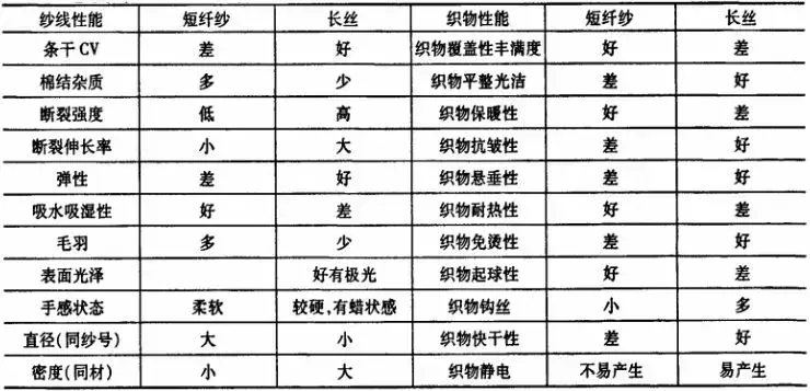 通过外包纤维与芯纱的结合,可以发挥各自的优点,弥补双方的不足,扬长避短优化成纱的结构和特性。一般短纤维与长丝及其织物性能的比较见下表。