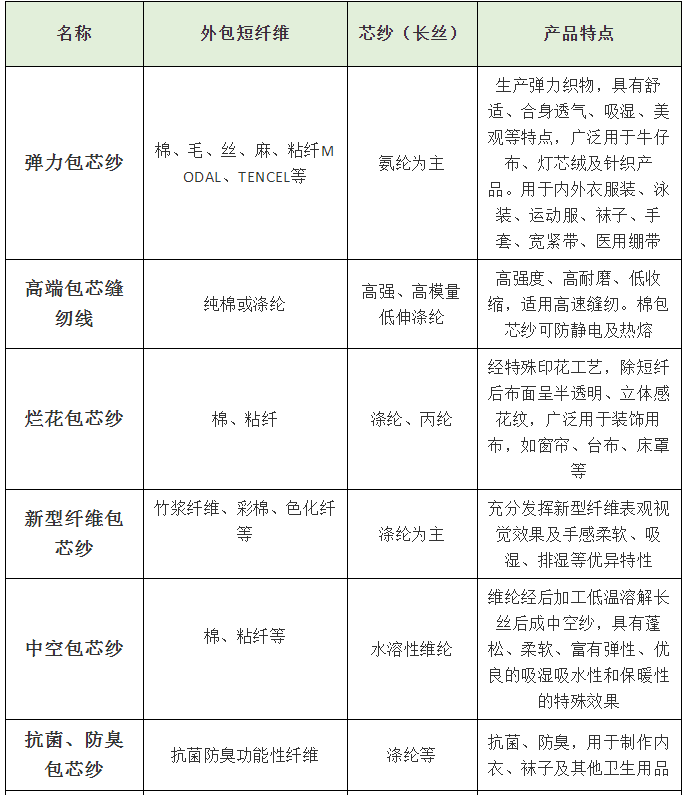 弹性包芯纱:氨纶、PTT纤维、PBT纤维等。以氨纶使用最广泛。
