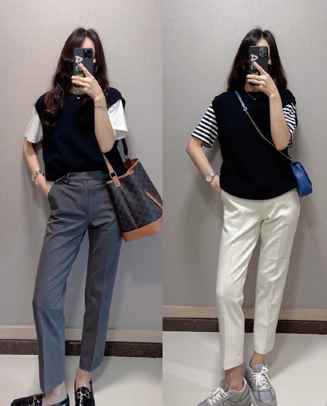 In addition to the above three stacking methods, knitted vests and T-shirts are also very good matching methods. It not only creates a sense of fashion, but also brings out the femininity of a woman, and also makes the outfit more layered. The blogger’s two looks are worth learning from. A white or striped T-shirt is paired with a knitted sweater, which is layered and a bit more capable. Very young and trendy.