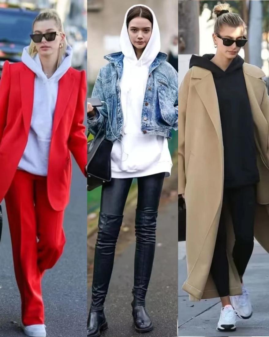 The more different the style of the jacket is from that of the sweatshirt, the more distinctive the fashion effect of layering them will be. If you are a woman who pursues individual fashion, you must try layering it with a suit jacket, it will look very stylish.