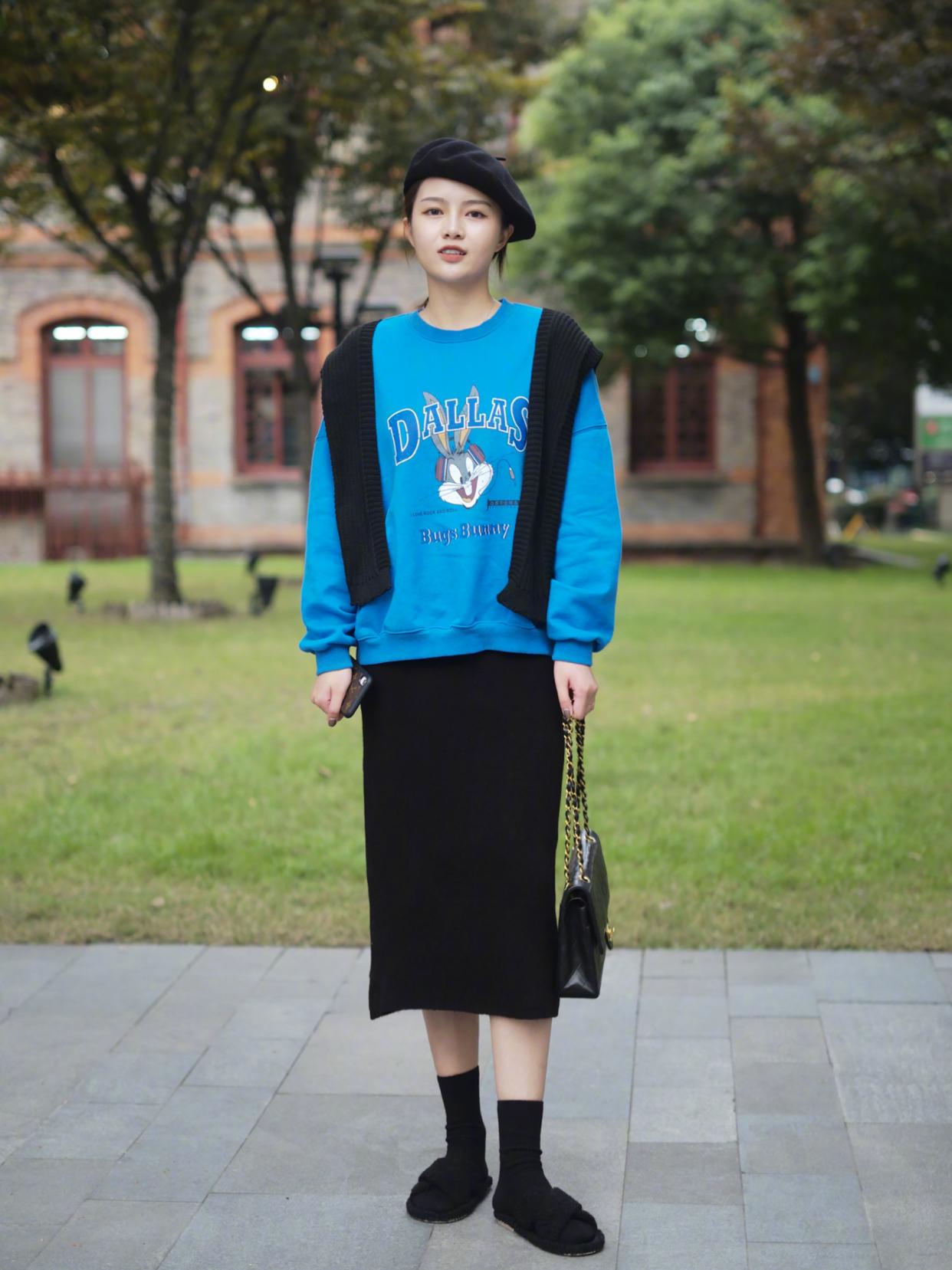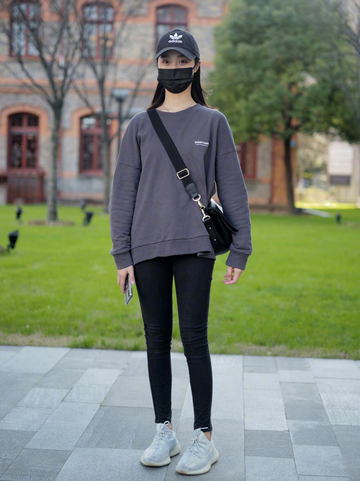 Pick a loose-fitting sweatshirt and pair it with tight pants or black leggings. The wide and narrow visual contrast highlights the lower body. The body lines place the focus of modeling on the upper body. When the vision is from top to bottom, it can extend the body line and make the legs appear taller and longer.
