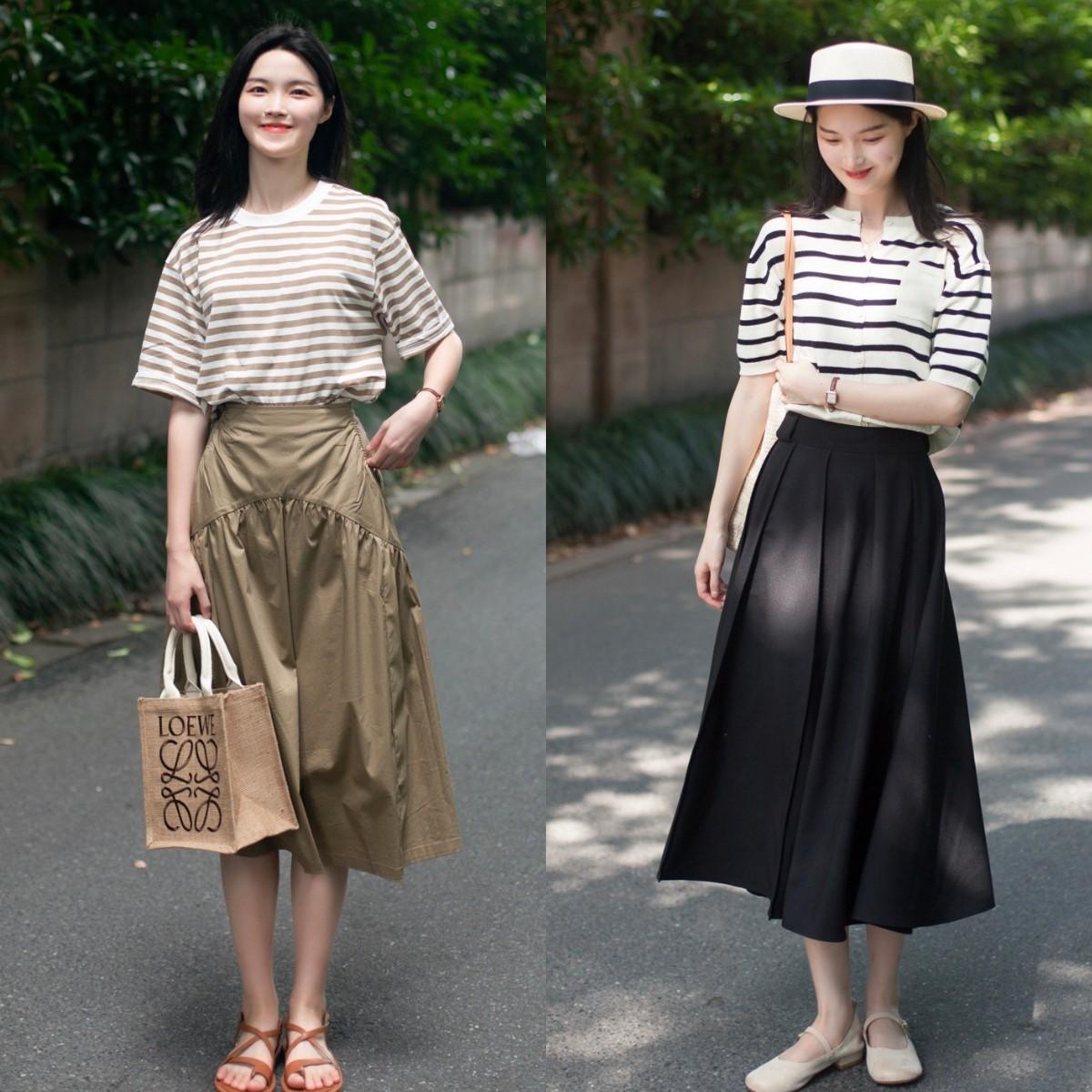In fact, the combination of T-shirts and skirts is not uncommon in summer. If we want to reduce the rate of shirt collision, we can make some adjustments to the color matching. I suggest you try moreSolid color T-shirts and beltsGet the picture belowThe combination of white umbrella skirt and colorful T-shirts and striped T-shirts span>. Use a white umbrella skirt to brighten your look while weakening the retro feel. Whether paired with a colored T-shirt or a striped T-shirt, it can make your look more eye-catching and fashionable.