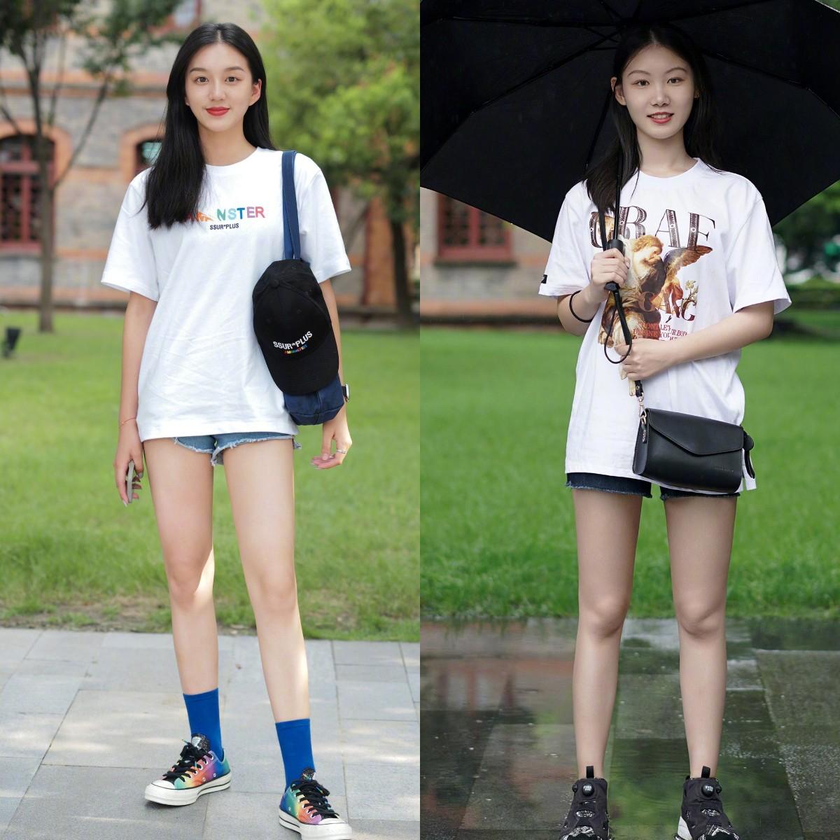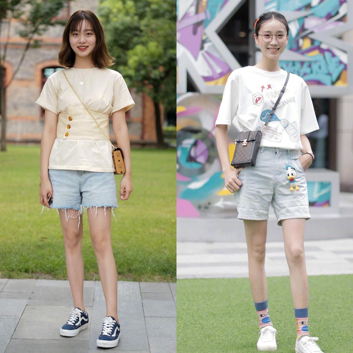 DenimshortspairedwithaT-shirtThemethodisverycommoninsummer.Itcannotonlylengthentheleglines,butalsocreateadynamiclook.Ifyouwearitonasmallperson,itwillnotonlymakeyourlegslooklongerbutalsoreduceyourage.
