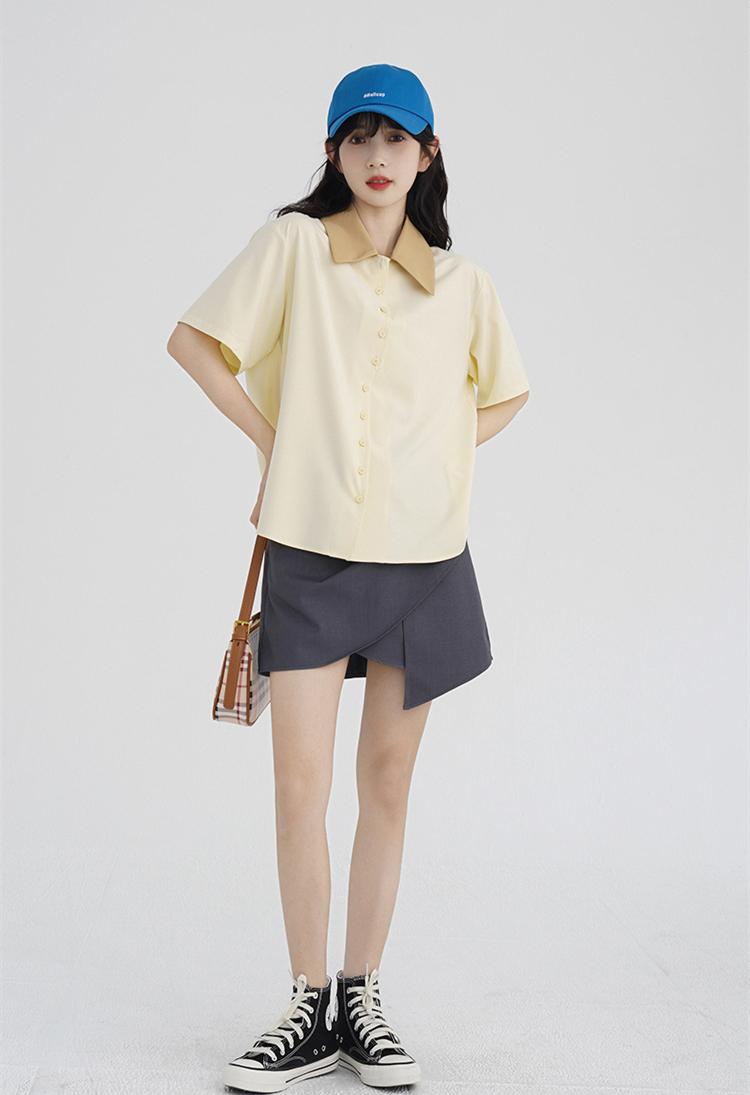 The combination of a T-shirt with a “splicing collar” design and an irregular skirt like the picture below is a negative example. The overall look is too messy and can easily bring down the style.