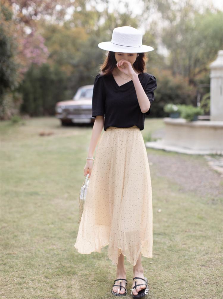 If you want to wear a gentler style, you might as well start with the one in the picture belowA gauze skirt with “polka dot elements” added. Pairing it with a solid color T-shirt can not only add romantic and elegant charm, but also enhance the layering of colors. , the return rate is super high.
