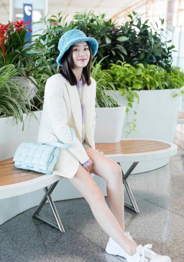 This look looks very ladylike. The upper body is lavender with a base layer and a light yellow suit jacket. It is very age-reducing and whitening. The lower body shorts can show off Yuan Shanshan’s slender legs. Although the hat on the head does not seem to match the season of clothing, it is still a kind of fashion