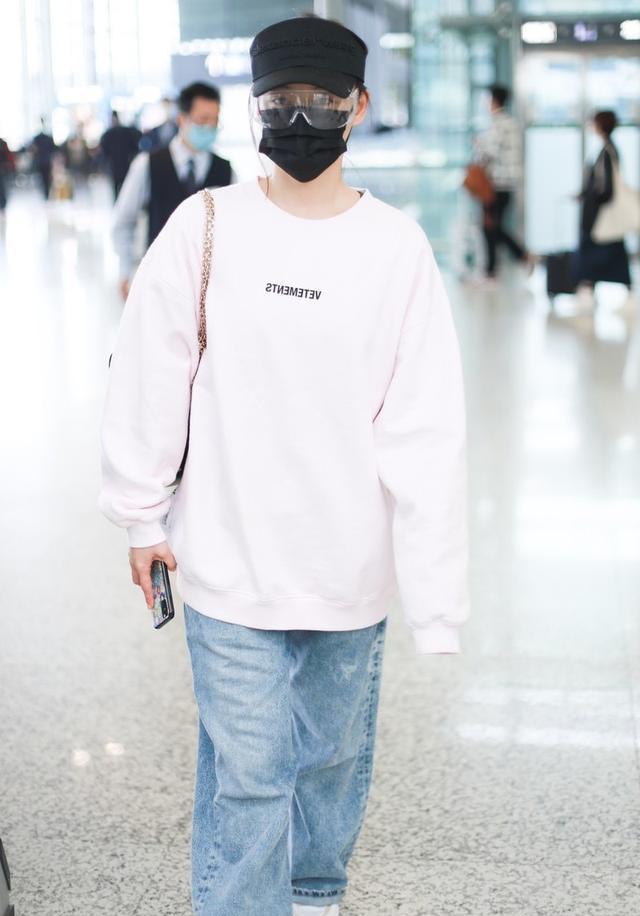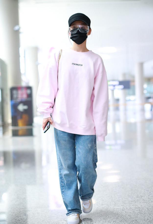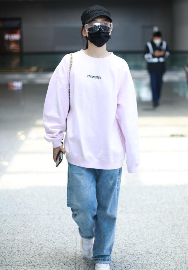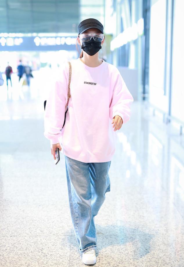 Yuan Shanshan walks in the airport in a people-friendly style, and her loose sweater is full of casualness. Safety goggles are safe and stylish. Yuan Shanshan wears a loose-fitting pink sweatshirt on her upper body. It is very eye-catching. It is also a very tender color. She looks very rosy and has fair skin. The loose style shows a casual and flesh-covering feeling. In fact, this style is more suitable for those who are slightly fat. Fat girl, if I had a figure like Yuan Shanshan, I would definitely choose a tight-fitting top that can show off my figure. Yuan Shanshan’s dress has a row of letter prints on the chest side. The letter print is a symbol of youthful vitality and will not make this dress look monotonous