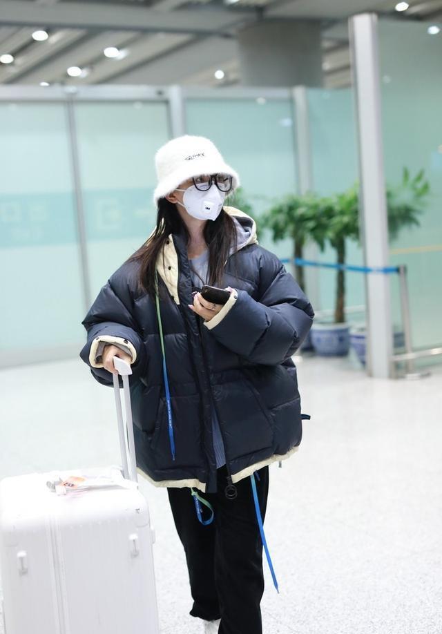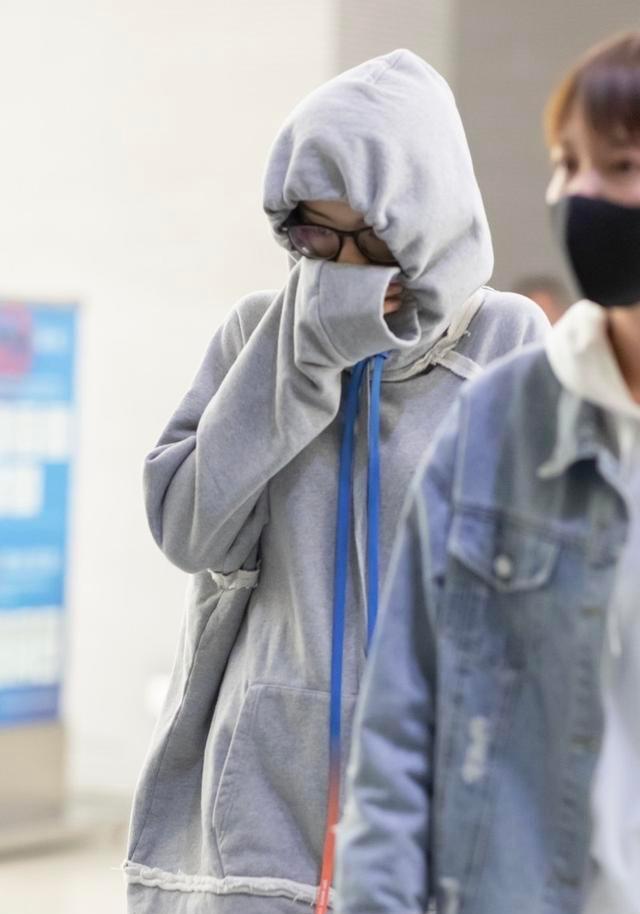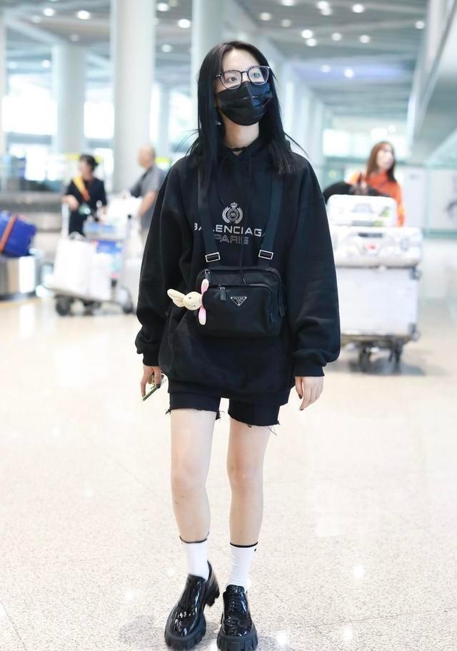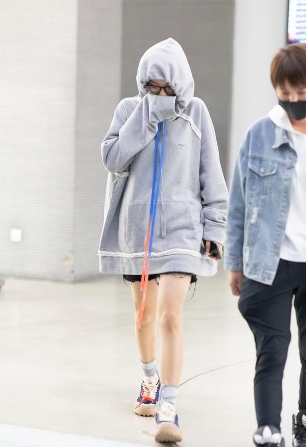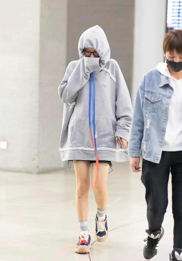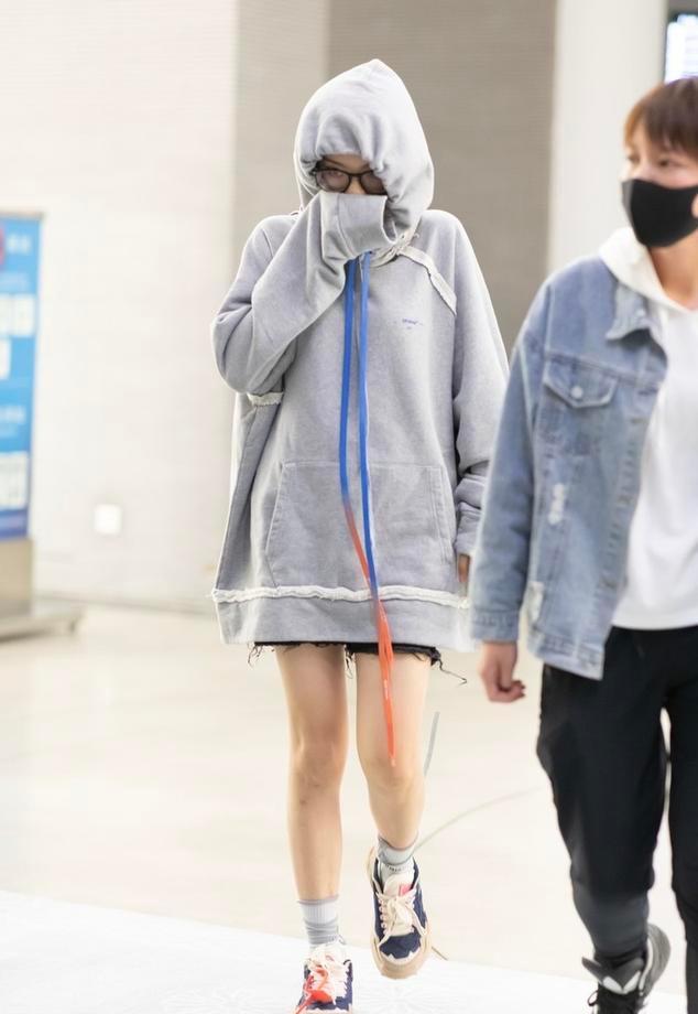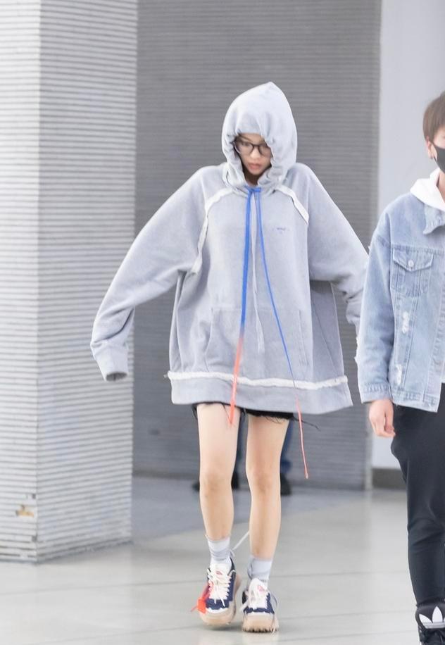 Yang Chaoyue puts the sweater hat on his head and looks even cuter with round glasses without makeup. Coupled with Yang Chaoyue’s own temperament, she is really a quirky girl. , it’s hard not to like her. The straps of the sweatshirt and hat are even more distinctive. The blue-orange gradient color looks very energetic. At this length, I’m afraid it’s longer than her legs
