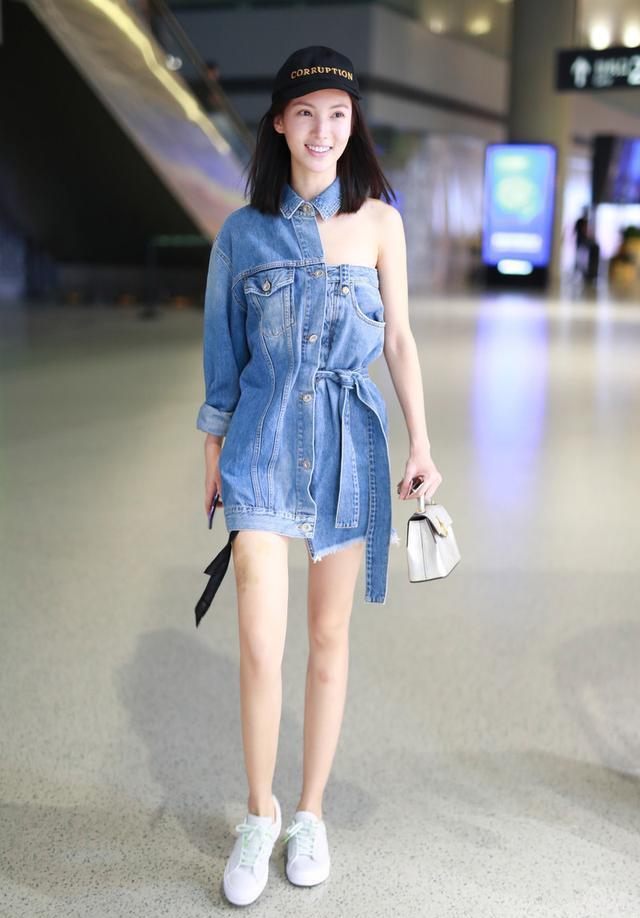 Denim is a material that will never go out of style. Jin Chen’s denim skirt is also very personal. The different styles on the left and right are also very obvious. The upper part of the right half exposes the skin and collarbone. In addition to showing off the figure In addition, it also has a bit of sexy feeling. A strap is added to the waist. The strap design outlines the waist shape well and will not make the loose style on the left side look bloated. A pair of white shoes are worn on the feet. Add a small white handbag to brighten the denim blue, which is very energetic