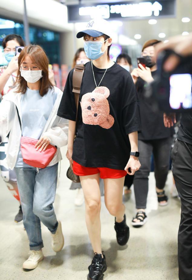 Li Yuchun is wearing a pair of red shorts. Although these shorts are relatively loose, they can well show off her slender figure. Legs are a more feminine type of clothing, but when worn on Li Yuchun, they feel unexpectedly handsome. This red color is bright and eye-catching. It complements her white skin and adds to her lively feeling. Pairing red with black creates a cool look that goes well with neutral-style clothing.