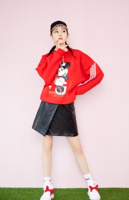 The red casual sweatshirt looks very outstanding and is very suitable for a beauty like Dilraba. Many people think that bright red will lower the overall appearance. In fact, bright red is the easiest way to show the unique temperament of girls. I have to admit that this red Mickey Mouse sweatshirt is very suitable for Di Lieba, and a breath of youthful vitality hits her face.