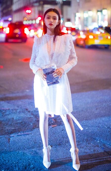 The white lace see-through dress makes Lin Yun look particularly fairy-like, and the overall feeling is more elegant. A pair of white high heels highlights this temperament to the extreme, which is quite perfect.