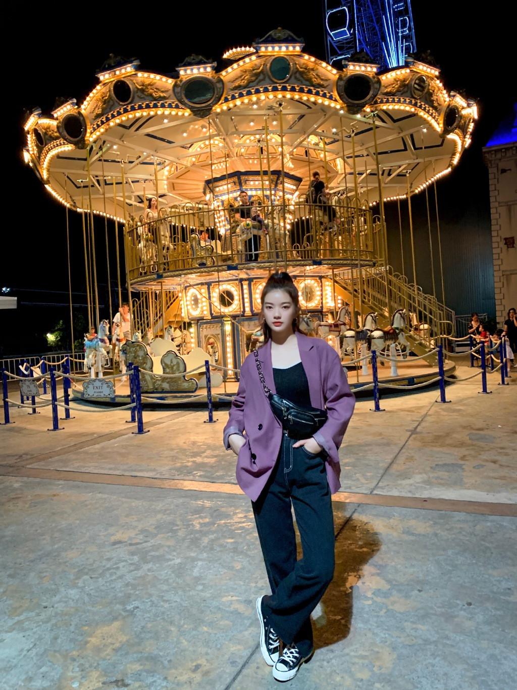 A black tight top paired with black wide-leg pants, a lavender suit jacket makes her look more fashionable, and the high ponytail is very energetic neat.