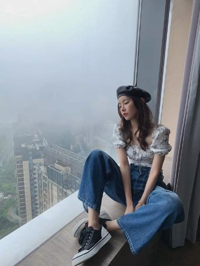 The pleated top with a square collar is an essential item in a girl’s wardrobe. The floral elements are added to make it more refreshing, and the puff sleeves She is also a girl who is slim, so she can never go wrong with denim wide-leg pants anytime~