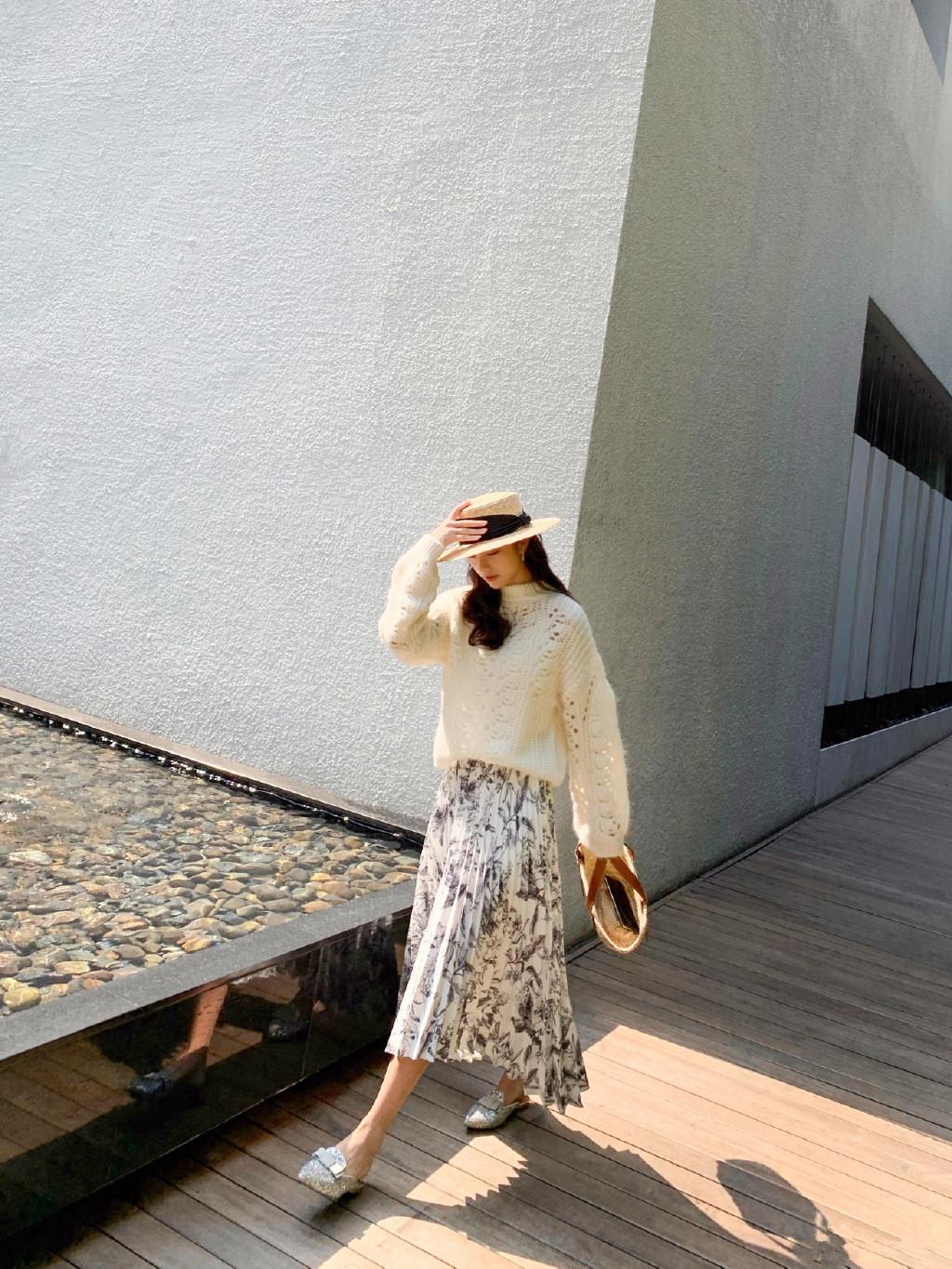The ripped knitted sweater is paired with a printed pleated white skirt. This outfit is very gentle, and paired with a straw hat, it is also very lazy.
