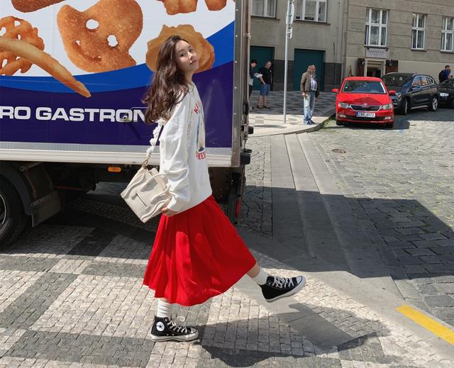 This set is casual and girly. When you buy a sweatshirt that is too big, don’t worry or rush to return it. Go to the closet Look inside to see if you have a skirt. A white oversize sweatshirt is paired with a red skirt. The color scheme is stunning but still everyday.