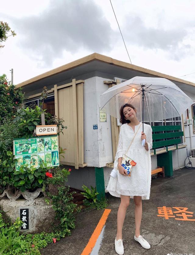 The white dress is very fresh, and simply paired with flat shoes, it is very fashionable. Holding an umbrella, she is as delicate as a doll.