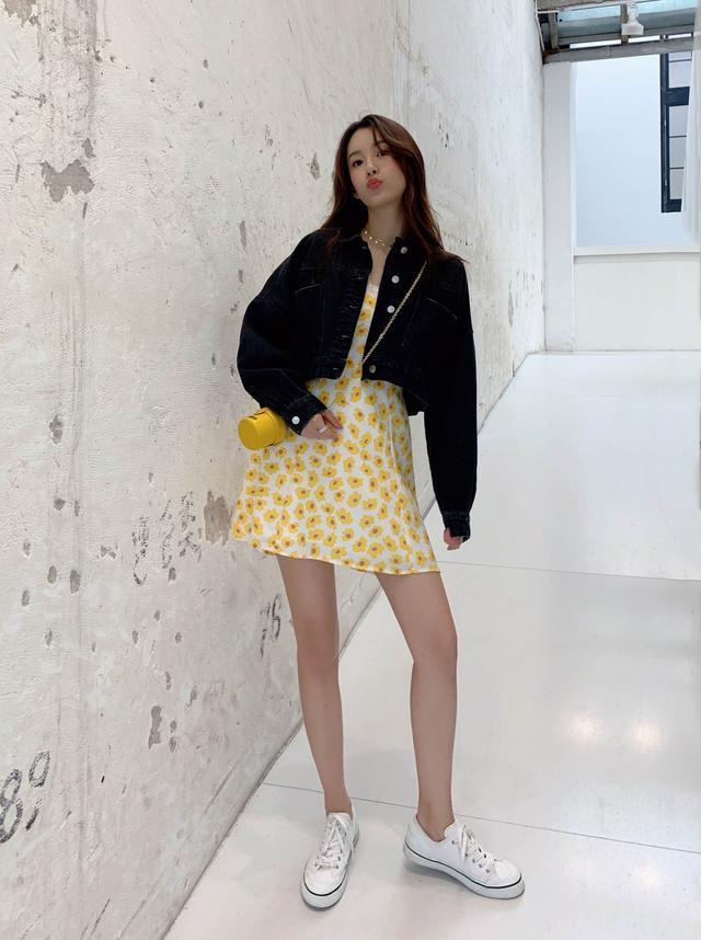 Bright floral dress and skirt, The slender legs are exposed and paired with a short black denim top to easily highlight the waistline.