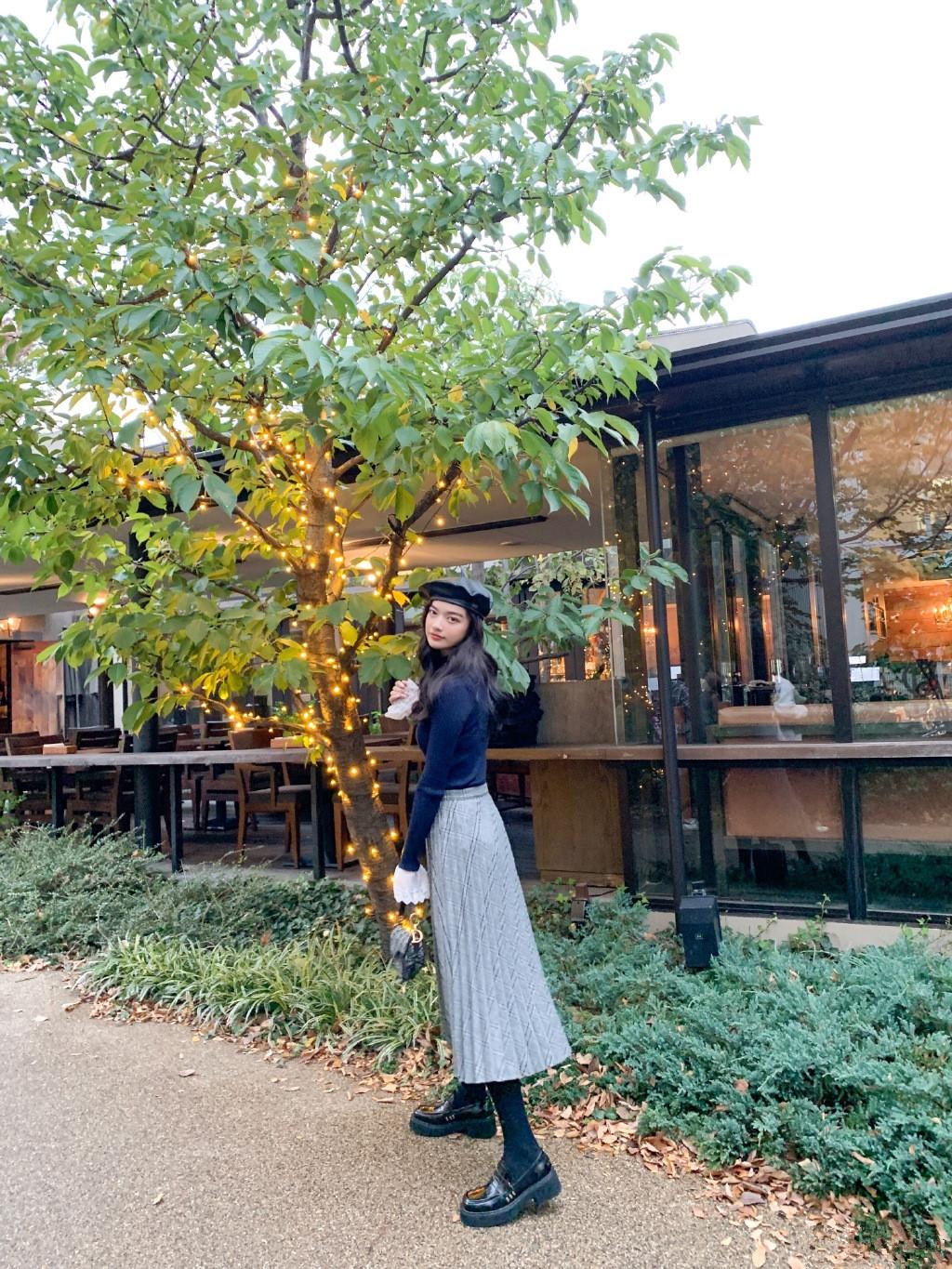 This set is more ladylike, with a black tight-fitting knitted top, white fabric spliced ​​at the sleeves, and a gray pleated skirt. , black leggings and round leather shoes are very retro.
