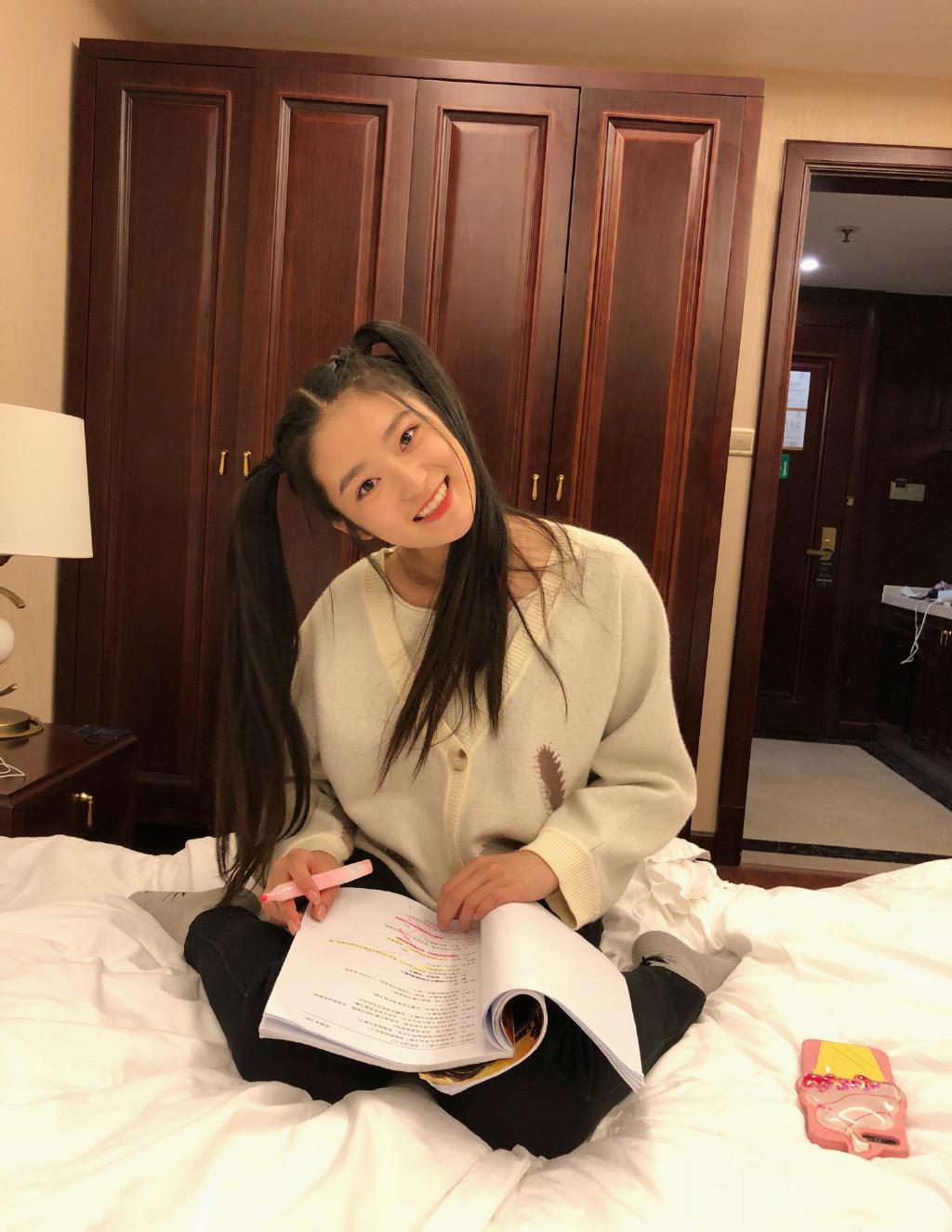 Twin ponytails are really a super cute hairstyle! That plmm looks five or six years younger, and is very energetic. He feels good when he looks at it. This knitted cardigan paired with black pants is simple and casual.