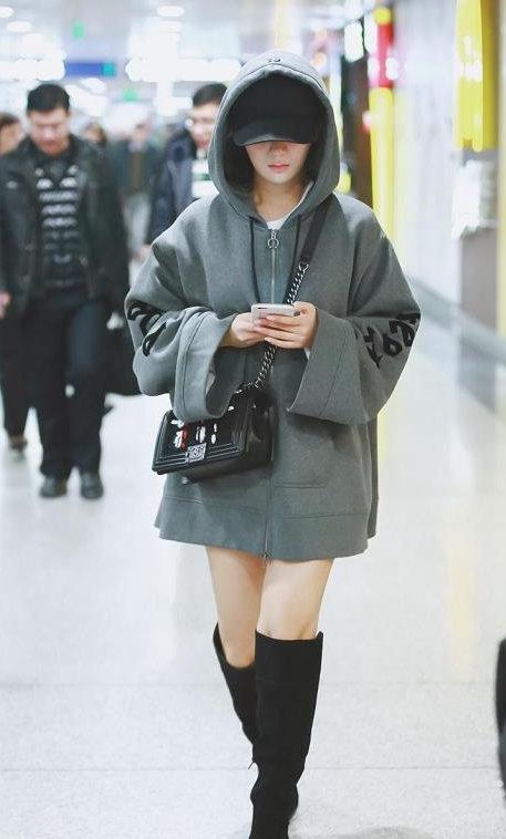 But when actresses become popular, they will engage in fashion marketing. But in fact, Yang Zi’s fashionable taste is not favored by many people. Some people always laugh at her that she is not thin enough. , her body shape is also not good, but this recent outfit has really perfectly solved all of Yang Zi’s shortcomings. This gray wide-sleeved zipper sweater, with a hat and a peaked cap, is very cool and street-like, and a pair of over-the-shoulder clothes on the legs Knee boots look slimming and fashionable.