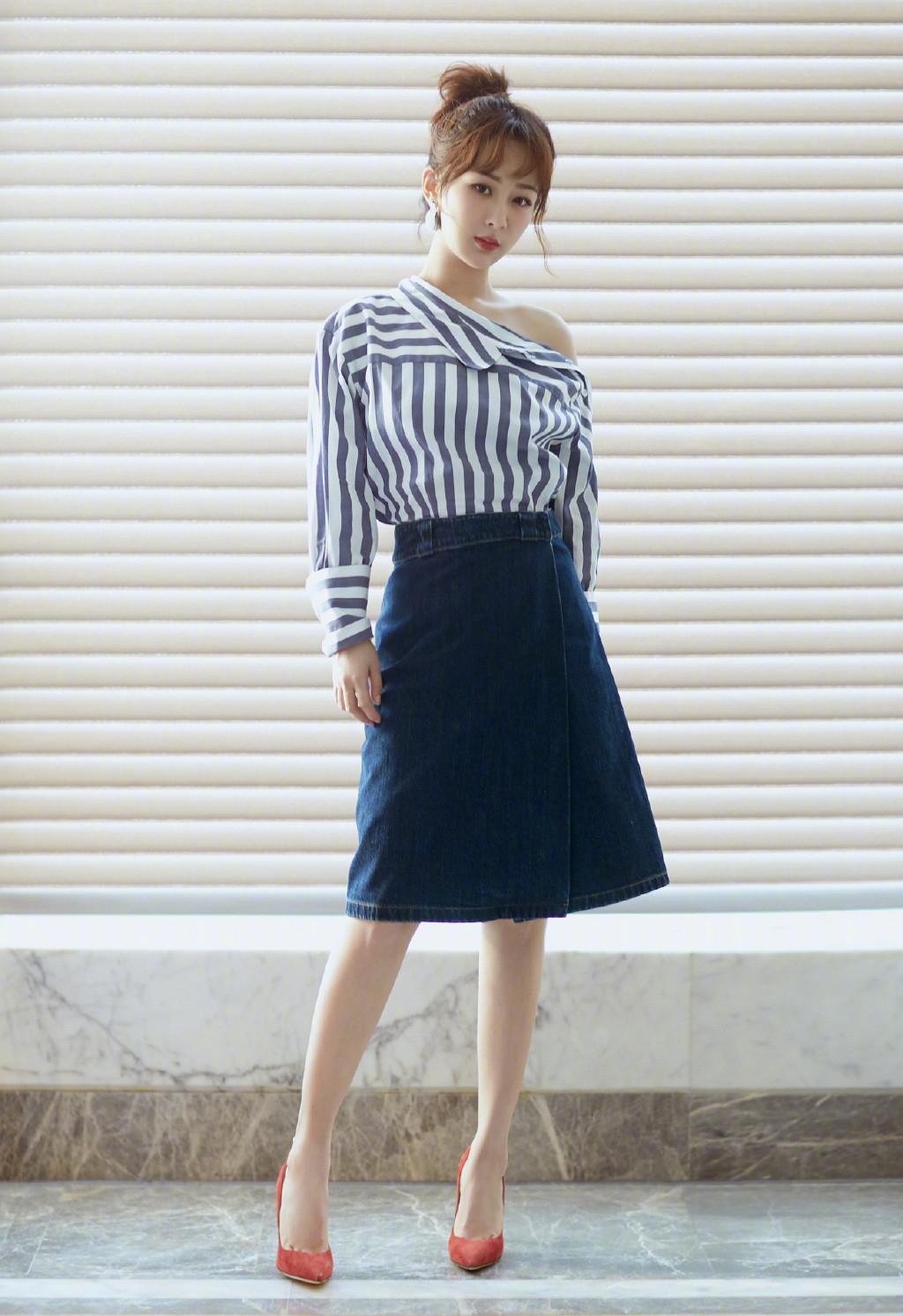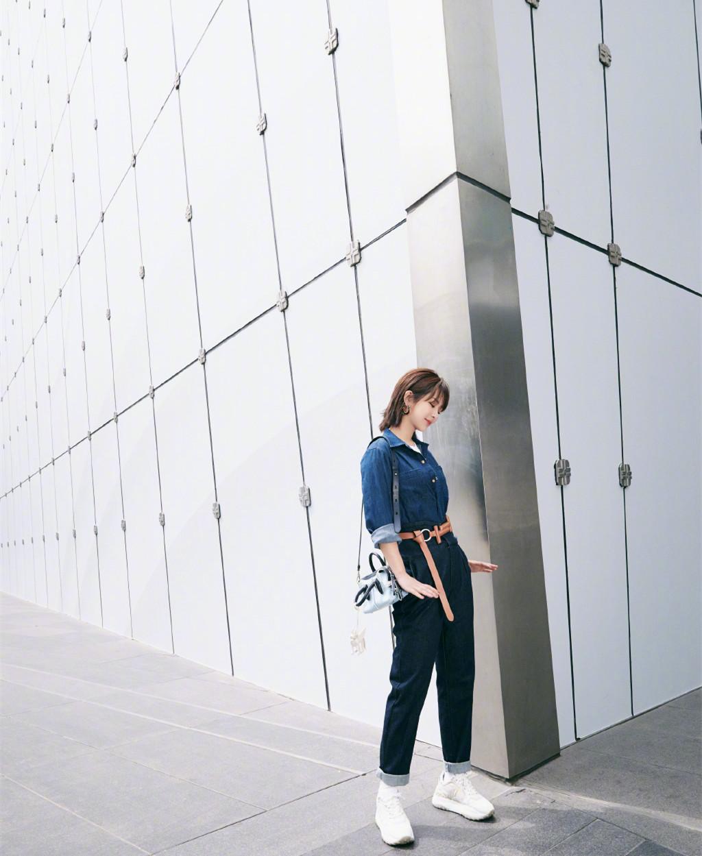 Denim overalls and a belt of other colors can transform Yang Zi into long legs.