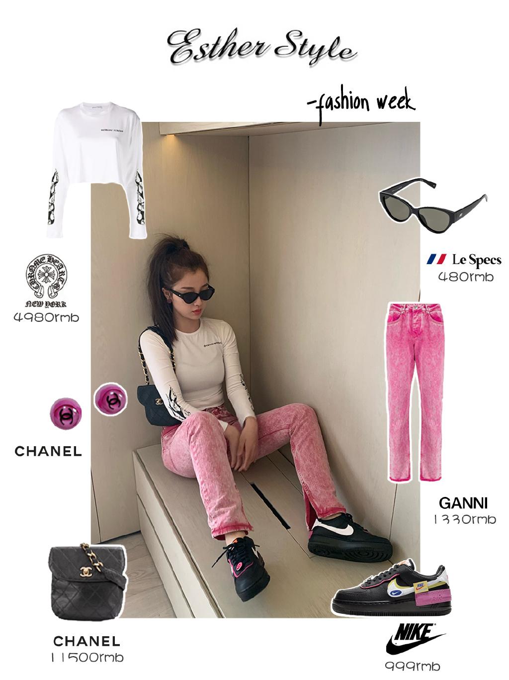 This black tight top paired with pink jeans looks more European and American. The high ponytail and sunglasses look cool and fashionable.