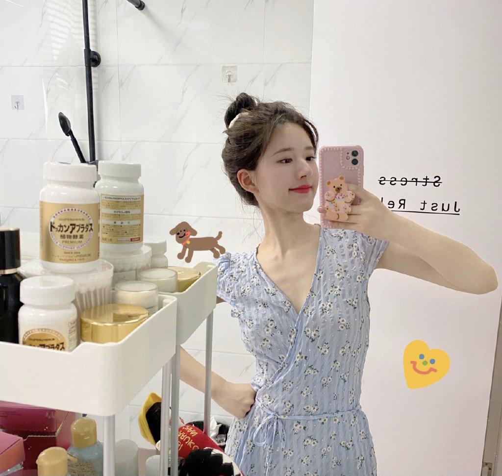 Zhao Lusi is wearing a blue floral dress, showing her youth and vitality. The blue waist skirt shows her height and the white baby collar design It adds a sense of playfulness to the whole look. Paired with a pair of white shoes on the feet, the whole person looks Japanese and fresh. There is a chain bag on the back. Even though she is wearing a mask, she is still beautiful.